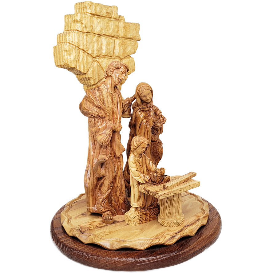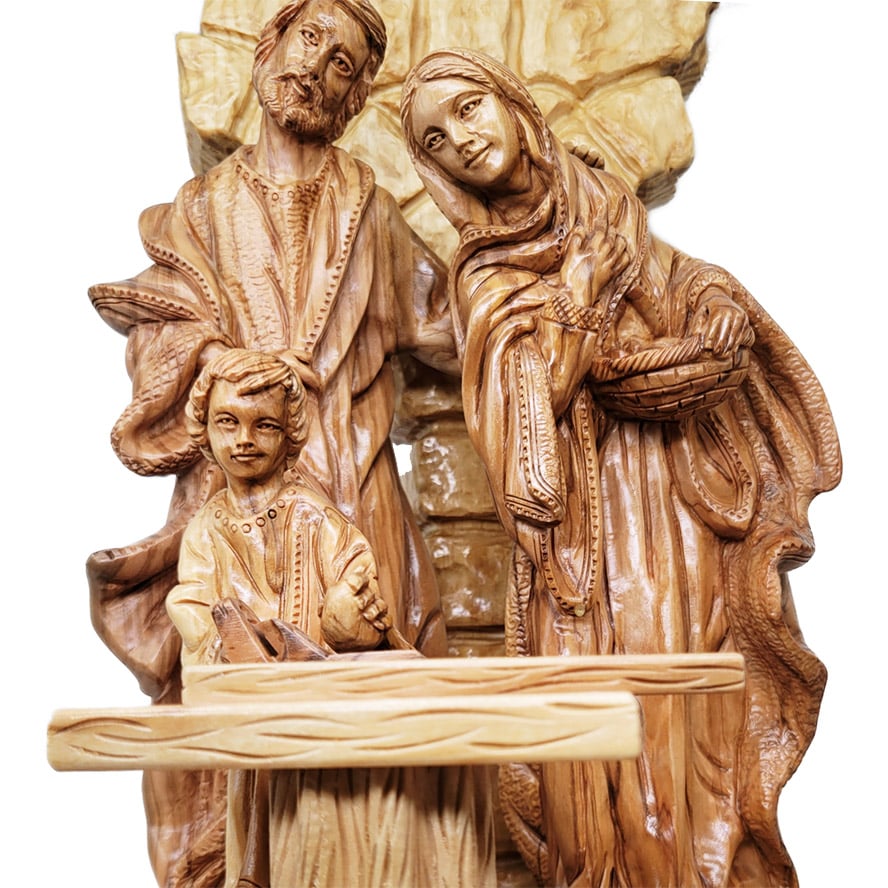 Bring the teachings of Jesus into your home with this stunning olive wood carving, depicting Jesus learning carpentry from Joseph the Carpenter as Mary lovingly watches. Inspired by Matthew 13:55, this handcrafted Biblical artwork is skillfully made by Holy Land artisans.